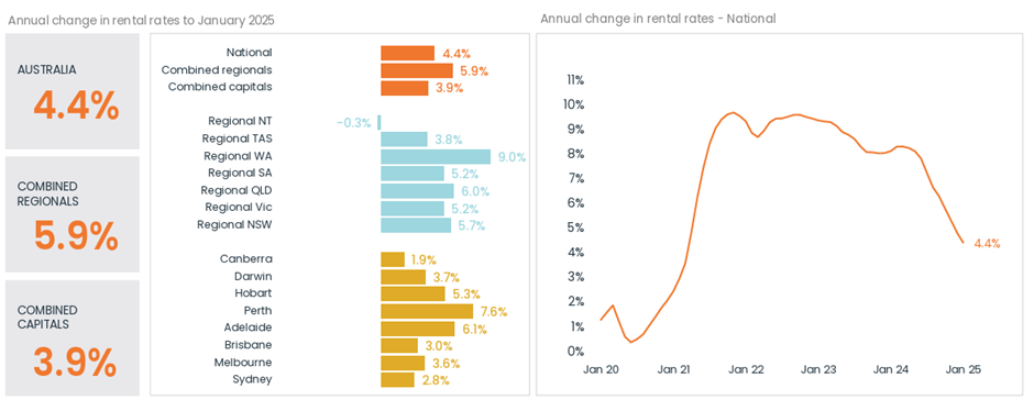 On an annual basis, Australian rents were up 4.4%, which is still more than double the pre-COVID decade average of 2.0% annual growth. However, with rental growth slowing more visibly through the second half of last year, the annual change in rents is likely to fall to below average levels in the first half of 2025.