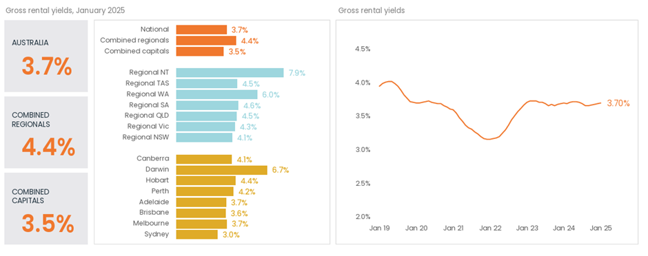 National gross rent yields continued to hold steady at 3.7% in January, with rental yields across the combined capitals and combined regionals holding firm at 3.5% and 4.4%, respectively. We'll likely see renewed downward pressure on yields in 2025 as values stabilise and rental growth eases further.
